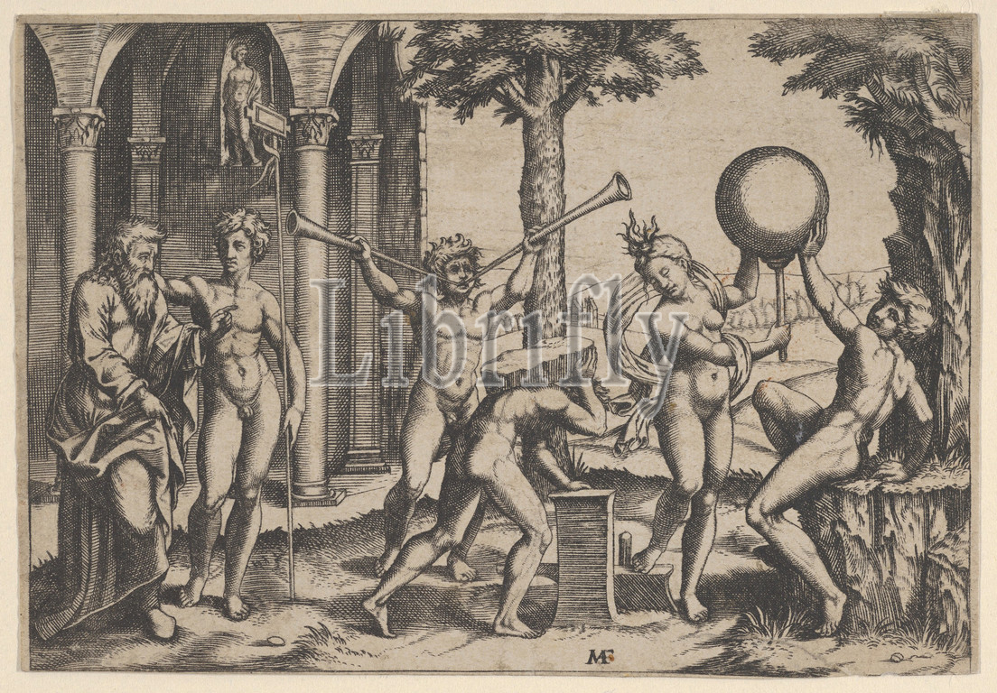 man, two trumpets, centre flanked, figures, old, young man, left, ca, 1520–50, Engraving, Sheet, 3 1/4, 4 11/16, 8.3, 11.9 cm, Prints, Anonymous, After Marcantonio Raimondi, Italian, Argini, ca., 1480–before, 1534, Bologna