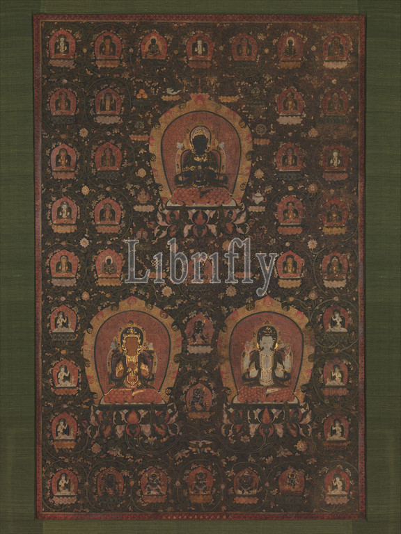 明, 佚名, 釋教三尊曼陀羅圬軸, Mandala, Vajradhara, Manjushri, Sadakshari -Lokeshvara, Ming dynasty, 1368–1644, dated 1479, China, Tangka, ink, opaque watercolor, gold, Image, 58 x 37 1/2, 147.3 95.3 cm, Paintings, Unidentified Artist, Tibetan, branch, Esoteric Buddhism, introduced, Mongol Yuan, dynasty, 1279–1368, continued, patronized, early Ming, emperors, fifteenth century, significant community, Tibetan lamas, remained, active, Beijing, site, former Mongol, capital, city, Dadu, 1402, principal