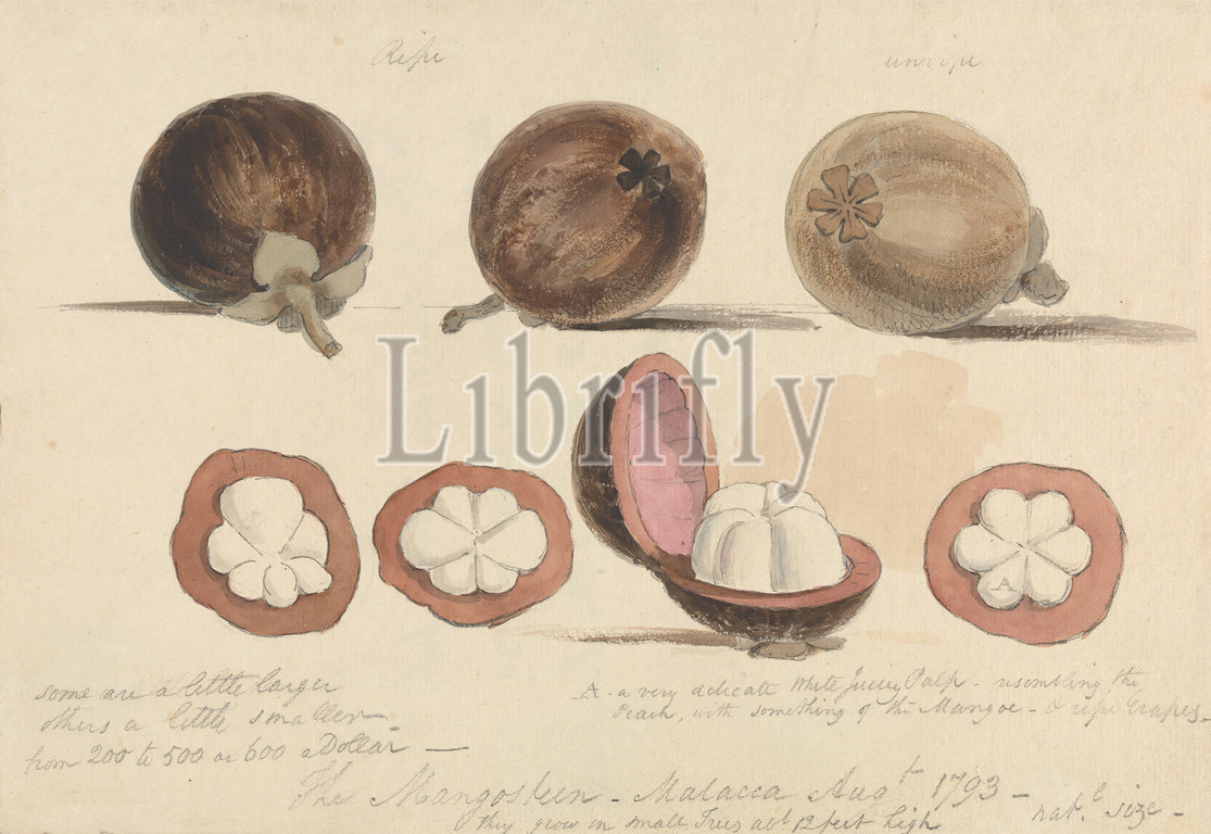 Mangosteen Fruit, Malacca, Samuel Davis, 1757–1819, British, 1793, Watercolor, graphite, medium, slightly textured, cream laid paper, Sheet, botanical subject, fruit, text
