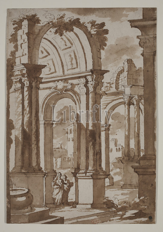 manner, Francesco Galli Bibiena, Italian, 1659-1739, Ruins, Building, Two Women, 18th century, pen, brown wash, preliminary drawing, graphite, cream laid paper, Sheet, 12 1/8