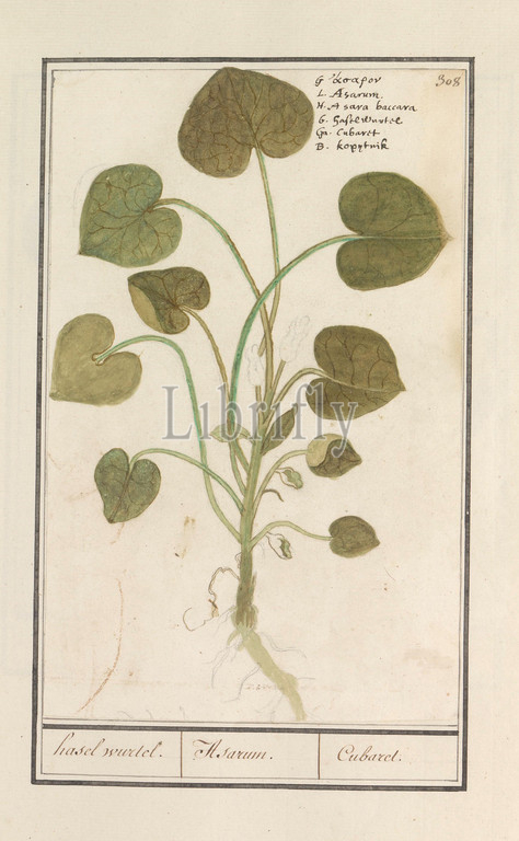 Mansoor, Asarum europaeum, hasel wurtel, Asarum, Cubaret, title, object, hazel root, Numbered top right, 308, top, name, six languages, Part, fourth album, drawings, flowers, mushrooms, Eleventh, twelve albums, animals, birds, plants, 1600, commissioned, Emperor Rudolf II, explanation, Dutch, Latin, French, Anselmus Boetius de Boodt, 1596, 1610, paper, watercolor, paint, deck paint, chalk, ink, pen