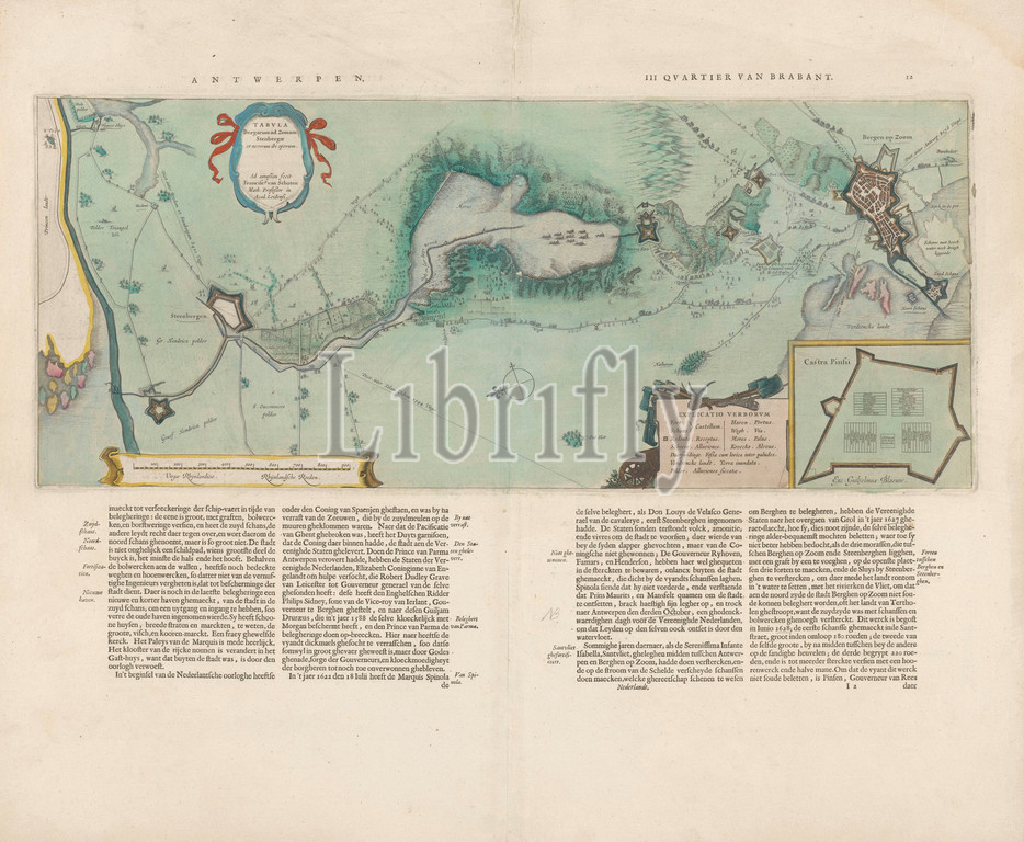 Map of the area between Bergen op Zoom and Steenbergen, Tabula Bergarum ad Zomam Stenbergae (title on object), Map of the area between Bergen op Zoom and Steenbergen. Below the map four half columns of text in Dutch. The bottom left of the map mainly shows fortresses. Trees, hills and farmland have been drawn. Bottom left the scale in Rhine rods. Bottom right legend surrounded by tools. Bottom right inset with map of a fortress, Castra Pinsii. Verso: two pages of text, maps of separate countries or regions, Bergen op Zoom, Steenbergen, Franciscus van Schooten (I) (mentioned on object), Amsterdam, 1630, paper, watercolor (paint), letterpress printing, h 22.4 cm × w 53.3 cm