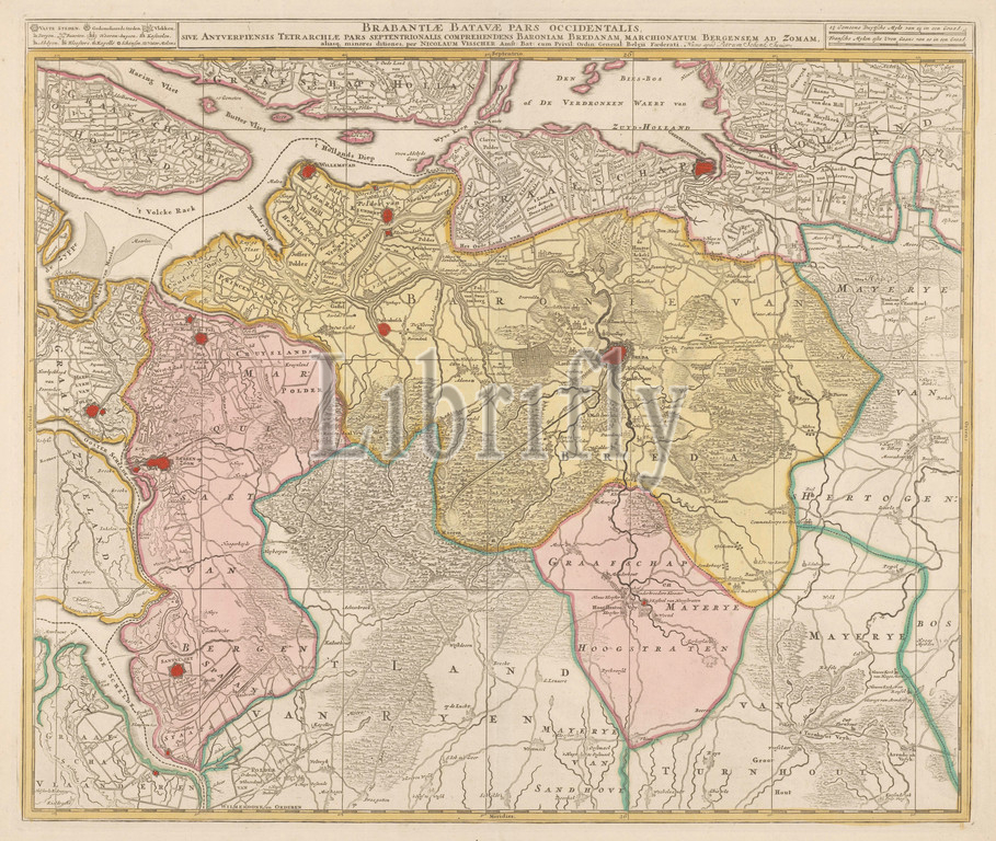 Map, Baronie van Breda, Brabantiae Batavae pars occidentalis, sive Antverpiensis tetrarchiae pars septentrionalis, comprehendens Baroniam Bredanam, Marchionatum Bergensem ad Zomam, title, object, barony, Breda, immediate surroundings, Top left legend, cities, towns, Top right, scale, German, French miles, maps, separate countries, regions, Brabant, Nicolaes Visscher, I, Amsterdam, c, 1680, 1780, paper, watercolor, paint, engraving