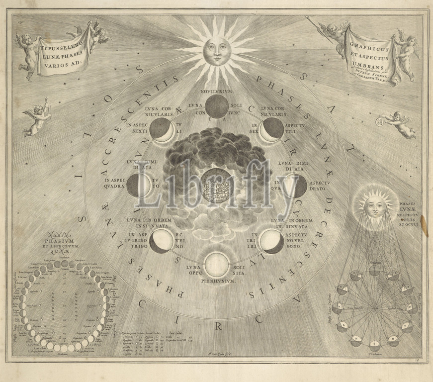 Map, earth, different positions, moon, sun, star chart, star map, map, square, circular form according, old ideas, shape, world, Johannes van Loon, mentioned, object, Amsterdam, 1708, paper, engraving