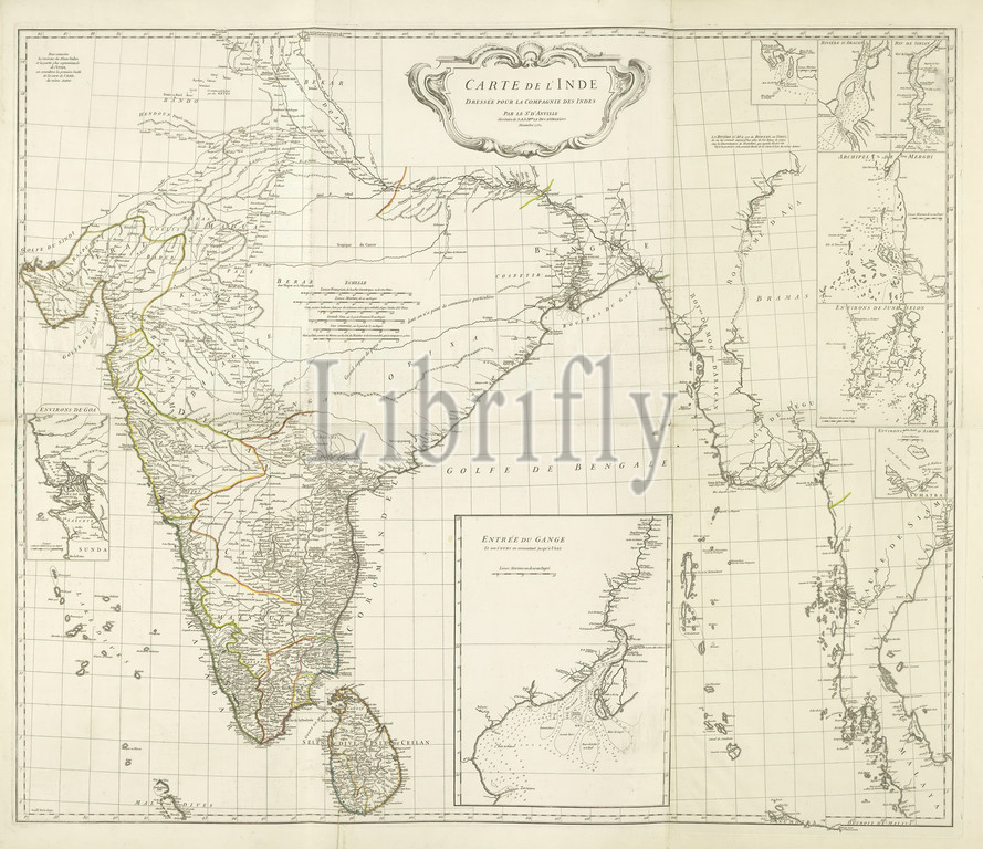 Map of India and the western coastal area of Burma, Siam and Malacca with 8 side cards. Carte de l'Inde: dressage pour la Compagnie des Indes / par le Sr. d'Anville (title on object), Map of India and the western coastal strip of Burma, Siam and Malacca, borders colored, with 8 minor points: surroundings of Goa, mouth of the Ganges, Negrais, the river Aracan, the river Sirian, the Merghi archipelago, Junk Selon area, Ashem area. The unknown area of the Ganges valley has been left blank and there are scales, maps of separate countries or regions, Burma, Thailand, India, Sri Lanka, Bangladesh, Malacca, Ganges., Jean Baptiste Bourguignon d'Anville (mentioned on object), Paris, Nov-1752, paper, engraving, h 886 mm × w 1058 mm