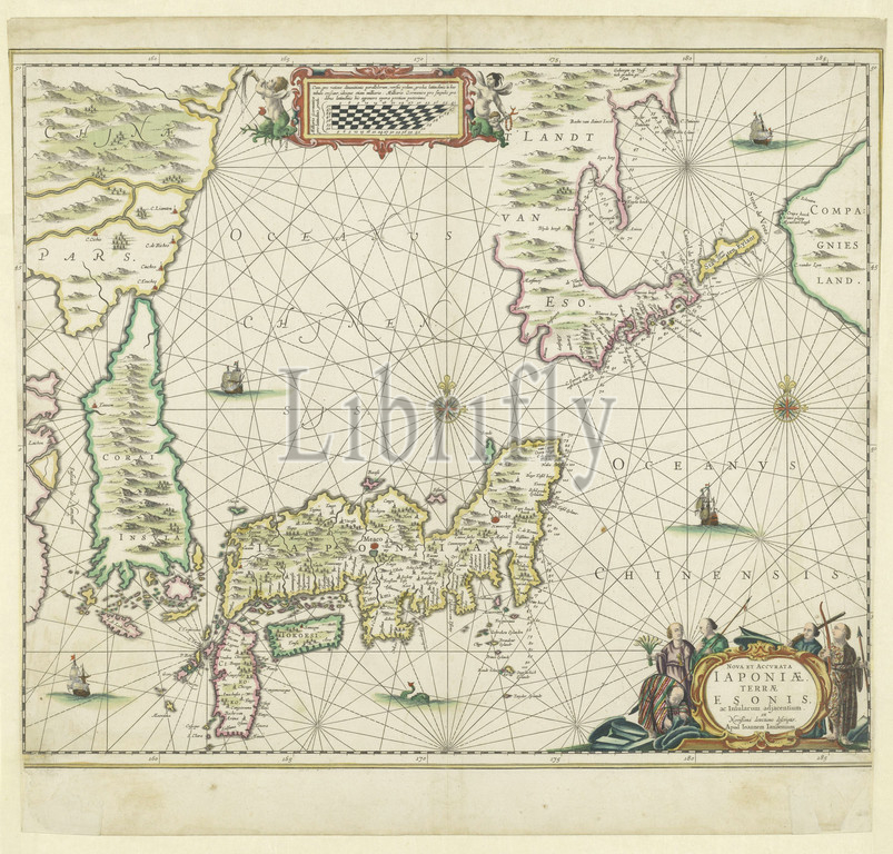 Map, Japan, Nova et accurata Japoniae, Terrae Esones, ac Insularum adjacentium, title, object, scale, 1, 5 mill, part, China, Korea, depth, indicated, coasts, various islands, countries, colored, borders, colored compass rose, middle, right, Four ships, sea, top, explanation, degree distribution, framed, flanked, three putti, Bottom right five Eastern men, three, weapons, bunch, flowers, weighed down, maps, separate countries, regions, Johannes Janssonius, mentioned, Amsterdam, c, 1658, paper, engraving