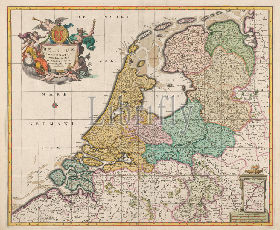 Map, Republic, Seven United Netherlands, Belgium Foederatum emendate auctum et novissime editum, title, object, Bottom right, bet, additional map, course, Maas, Maastricht, Wessem, left, cartouche, title surrounded, putti, trumpet-blowing angel, Mercury, Neptune, woman, globe, inscription, angel holds, round shield, arms, Netherlands, dish, lion heads, pedestal, Fire beats, bowl, scale, shown, base, German, French miles, map, Inscription, Dutch Republic, Nicolaes Visscher, I, mentioned, Amsterdam, 1677, 1679, paper, watercolor, paint, engraving, l 46 6