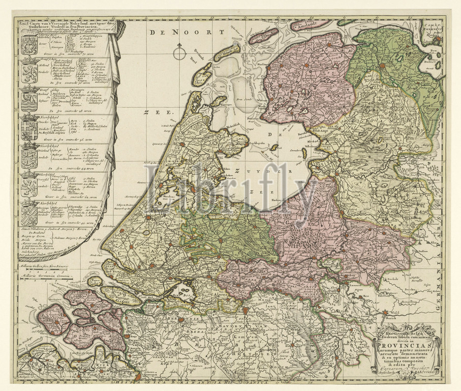 Map, Republic, Seven United Netherlands, Caerte Country, United Netherlands, rest, subject, divided, syn Provincia, Exactissima Belgium Foederati Tabula cum annexis divisa, Provincias, left, arms, seven provinces, province, subdivision, regions, numbers, cities, villages, vlecken, lands, knights, academies, colleges, Admiralty, Flanders, added, description, weapon, Bottom right, cartouche, title, Latin, colored differently, areas, left uncoloured, maps, separate countries, coat, symbol, state, etc, provincial, Netherlands, Caspar Specht, 1702, 1726, 1750, paper, engraving