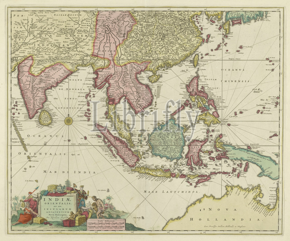 Map of Southeast Asia with Indonesian Archipelago Indiae Orientalis nec non insularum adiacentium nova descriptio (title on object), Map of Southeast Asia with Indonesian Archipelago, different areas of different colors. In the middle left a compass rose, bottom left at the cartouche inhabitants of various Asian countries, goods and landscape around the inscription. Bottom left also the scale in German and French miles (1: 250 000), maps of separate countries or regions, southeast Asia, Indonesia, Indonesian Archipelago, Nicolaes Visscher (I) (mentioned on object), Amsterdam, 1650 - 1700, paper, engraving, h 459 mm × w 555 mm