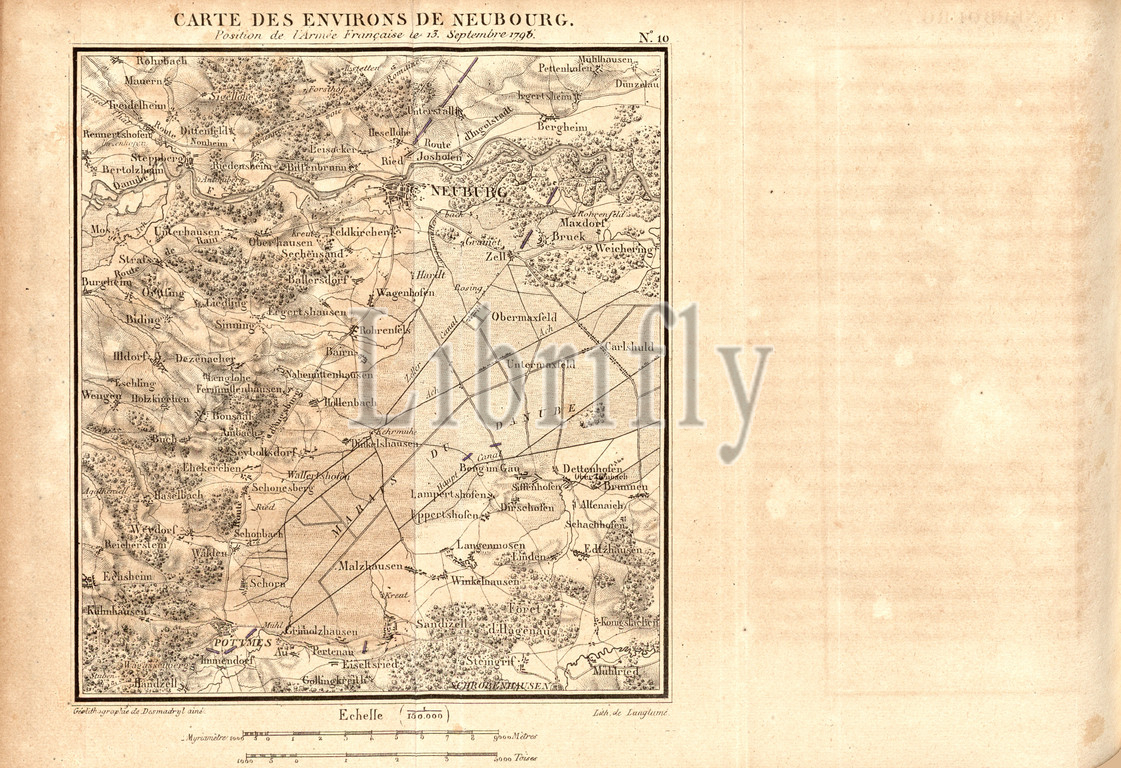 Map of the surroundings of Neubourg, Map Surroundings Neuenburg Baden-Württemberg Germany, N. 10, after S. 252, S. 271, Tome 3, Desmadryl ainé (Géolithographie); Langlumé (lith.), Maréchal [Laurent de] Gouvion-Saint-Cyr: Mémoires sur les campagnes des armées du Rhin et de Rhin-et-Moselle, de 1792 jusqu'à la paix de Campo-Formio. Tome 3. Paris. Anselin, libraire pour l'art militaire, 1828-1829