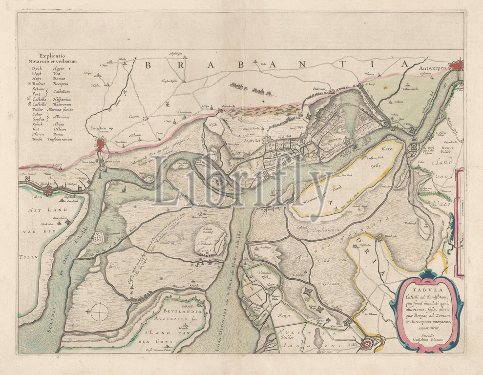 Map, surroundings, Zandvliet, Tabvla Castelli ad Sandflitam, terms, simul inundati agri, alluviones, foßæ, alvei, quae Bergas ad Zomam, Antverpiam interjacent, annotantur, title, object, North, left, borders colored, cities, buildings, flags indicated, roads sometimes populated, Top left explanation, symbols, map, center right scale, country miles, Verso, two pages, text, maps, separate countries, regions, Antwerp, Bergen op Zoom, Willem Janszoon Blaeu, Amsterdam, 1642, paper, watercolor, paint, engraving