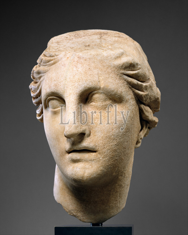 Marble head of Athena, Hellenistic, ca. 200 B.C., Greek, Marble, H. 19 in. (48.26 cm), Stone Sculpture, The dynamic movement and passionate expression of this colossal head mark it as a rare example of monumental art from the late third to the second century B.C., when an exaggerated baroque style prevailed in some areas of the Mediterranean