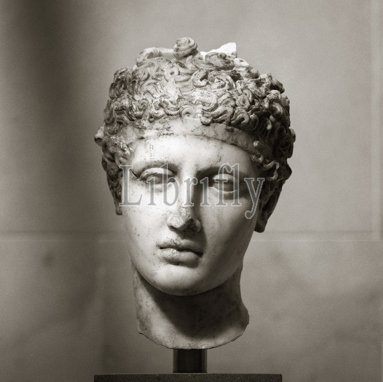 Marble head, athlete, Mid-Imperial, Antonine, ca, .D, 138–192, Roman, Marble, H, 13 1/2, 34.3 cm, Stone Sculpture, Copy, Greek bronze statue, 450–425 B.C., head, youth wearing, fillet, band, must, statue, victorious athlete, rested, arm lightly, remains, rectangular support, curls