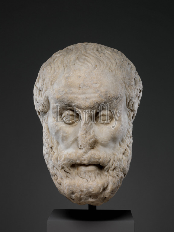 Marble head, philosopher, Imperial, 1st, 2nd century .D, Roman, Marble, Pentelic, H, 12 13/16, 32.5 cm, Stone Sculpture, Copy, Greek statue, last quarter, 3rd B.C., spite, battered condition, portrait conveys, personality, great thinker, striking similarities, head, portraits, Aristotle, 384–322 B