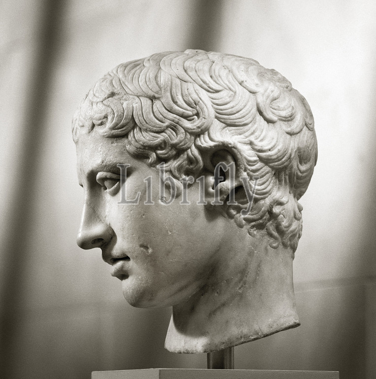Marble head, youth, Early Imperial, Claudian, ca, .D, 41–54, Roman, Marble, H, 11 1/4, 28.6 cm, Stone Sculpture, Copy, Greek bronze statue, 450 B.C, attributed, Polykleitos, head, associated, statue, nude athlete, held, diskos, famous Greek, sculptor, rigorous, mathematically based, proportions, figures