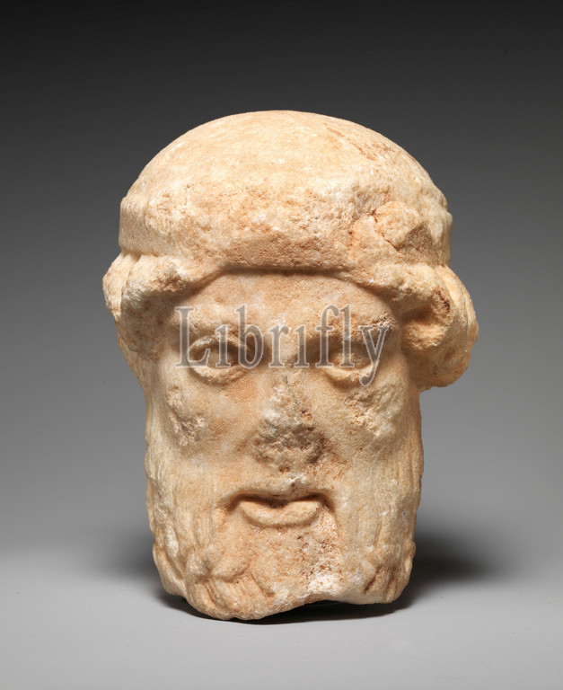 Marble herm head of a bearded deity, Classical, ca. 450 B.C., Greek, Attic, Marble, H. 6 7/16 in. (16.4 cm), Stone Sculpture, The angular transition between the sides and the back of the neck indicates that the head comes from a herm rather than a statue. Herms, the rectangular pillars surmounted by a head of Hermes, are first attested during the last quarter of the sixth century B