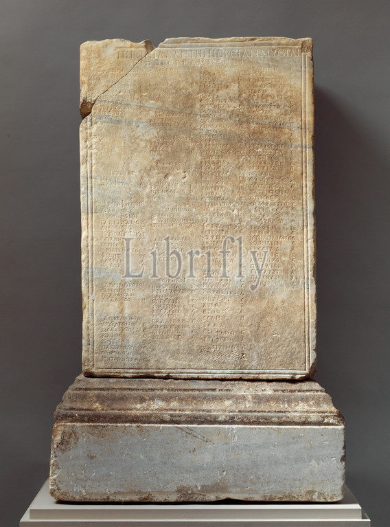 Marble inscribed statue base, Mid Imperial, Antonine, ca, .D, 160–170, Roman, Marble, H, 44, 111.8 cm, width 22, 55.9, depth 17, 43.2, Stone Sculpture, base, said, Rome, inscription, Greek, records, dedication, statue, honor, Pompeia Agrippinilla, priestess, erected, fellow members, Bacchic cult