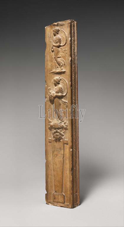 Marble pillar, Neo-Attic reliefs, Imperial, Augustan, late 1st century B.C.–early .D, Roman, Marble, H, 39 5/8, 100.6 cm, Stone Sculpture, fine, example, classicizing art, marble, bears, four sides, reliefs, style, themes, drawn, world, Dionysus, flowering acanthus, plant, carved, low relief, occupies, long, higher, two female, figures, billowing garments, surmount, Silenus herm