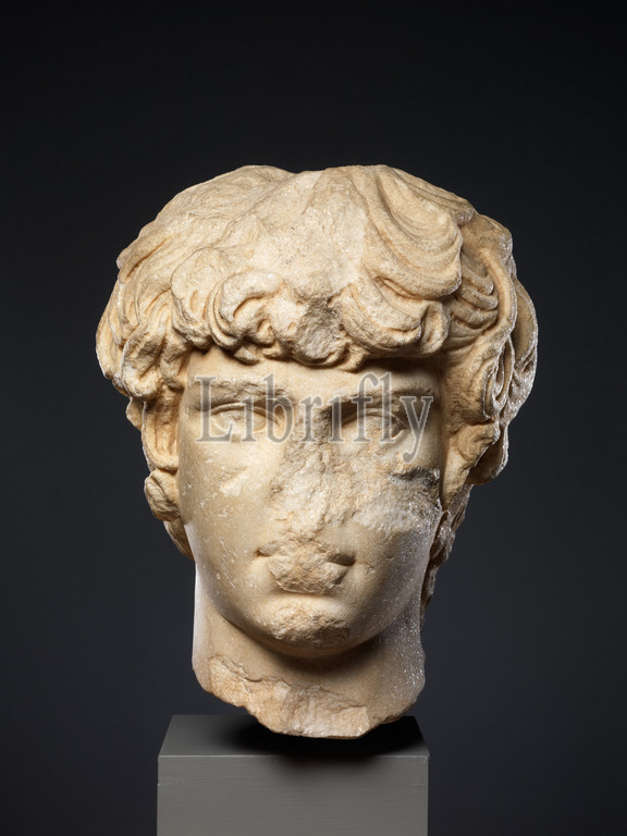 Marble portrait head of Antinoos, Late Hadrianic, ca. A.D. 130–138, Roman, Marble, Height: 14 1/2 in. (36.8 cm), Stone Sculpture, This head is almost certainly from a monumental statue of Antinoos. Characteristically, the head is turned slightly to the left and gazes downward, the tousled hair hanging long in the back. Worship of the deified Antinoos, the favorite of the Roman emperor Hadrian, flourished in the East, especially in his homeland, Bithynia