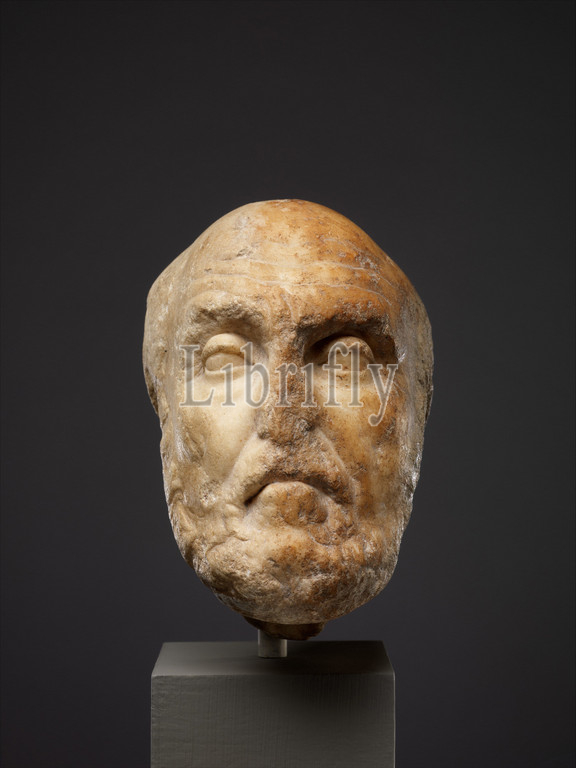 Marble portrait head, philosopher Chrysippos, Early Imperial, 1st century .D, Roman, Marble, 5 1/2, 14 cm, Stone Sculpture, Copy, Greek statue, late 3rd century, B.C, Euboulides, Chrysippos, important Stoic, philosophers, third, writings helped, establish, Stoicism, major philosophical, movement