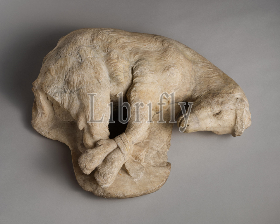 Marble statue, bound goat, Imperial, 1st–2nd century .D, Roman, Marble, Pentelic, h, 15 1/2, 39.4 cm, w, 20 3/8, 51.7, Stone Sculpture, sensitively, rendered, goat, feet, realistically, evokes, widespread practice, animal sacrifce, ancient Greece, statue, votive offering, perhaps, deity, rustic nature, Pan, Artemis, Dionysos