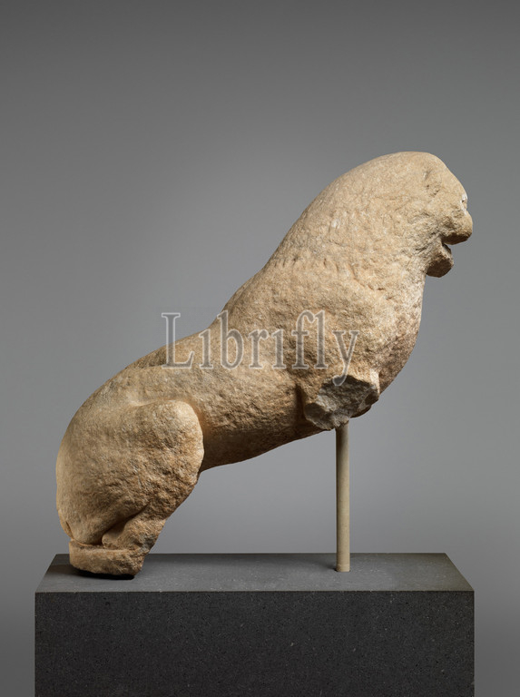 Marble statue, seated lion, Archaic, ca, 500 B.C, East Greek, Lydian, Marble, H, 16 1/4, 41.3 cm, Stone Sculpture, Excavated, Sardis, statues, another, eagle, precinct, Artemis, group, assembled, re, base, Roman period, great floods, disrupted, sanctuary