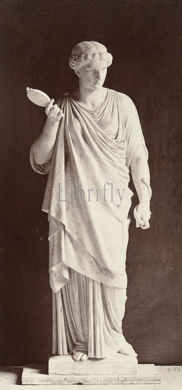 Marble statue, woman, high-necked dress, mirror, right hand, snake, left hand, Louis-Emile Durandelle, Ducher et Cie, c. 1878-1881