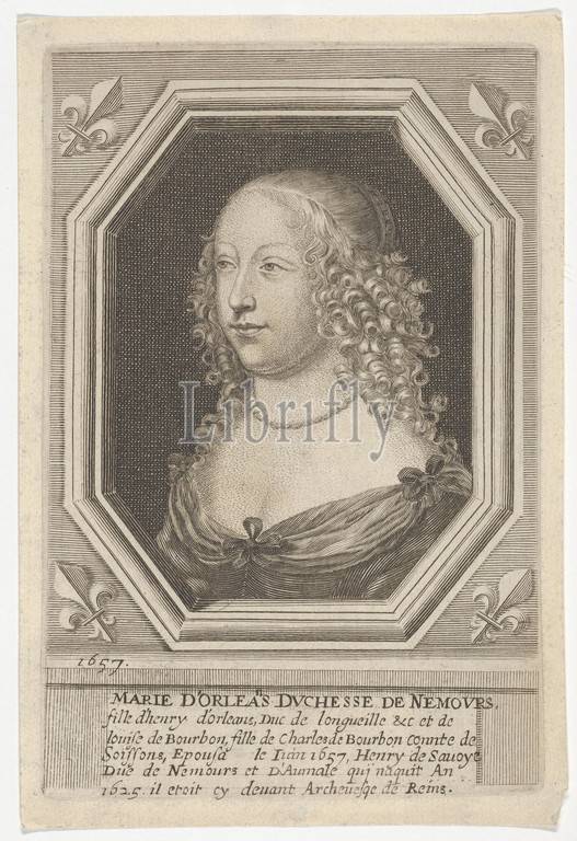 Marie d'Orleans, Duchesse de Nemours, ca, 1657, Etching, engraving, Sheet, 7 1/16, 4 13/16, 18, 12.2 cm, Prints, After Robert Nanteuil, French, Reims, 1623–1678, Paris