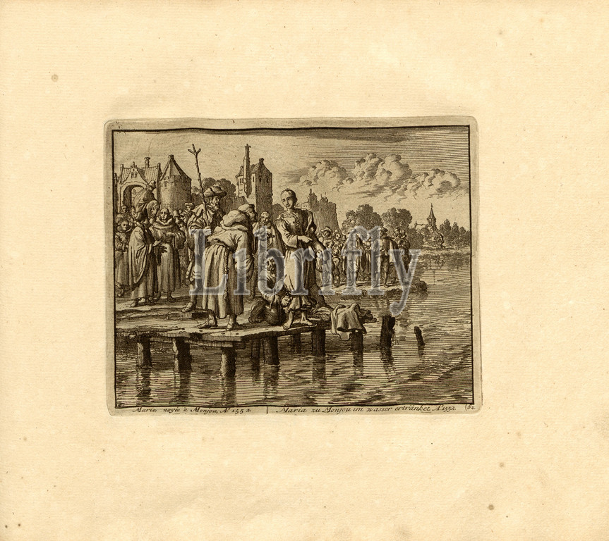 Marie drowned in Monjou, Anno 1552, Parallel Title: Maria drowned in Monjou in water, A nn o 1552, copperplate engraving, 62.), p. 133, Luyken, Jan (inv. et fec.), Jan Luyken: Théâtre des martyrs: depuis la mort de J.Christ jusqu'à present: représenté en très belles tailles-douces = Schau-Bühne der Martyrer; gezeichnet und in Kuppfer gestochen. Leyde: chez Pierre Van der Aa, [1711]