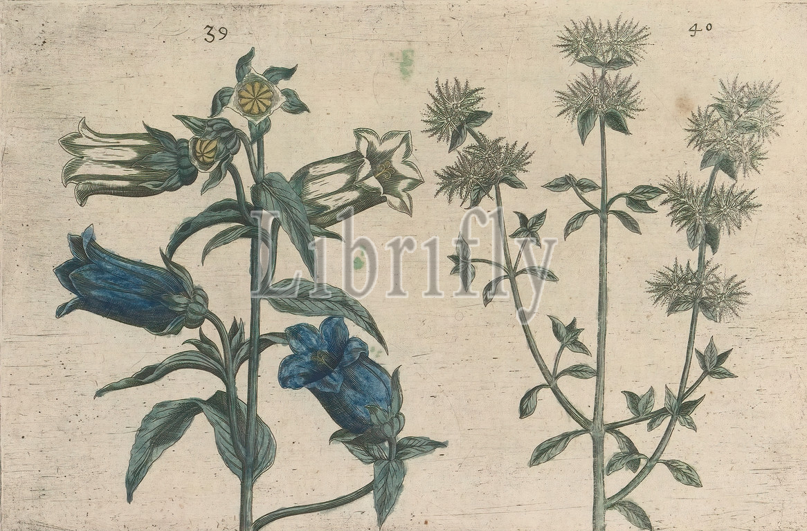Mariette clock (Campanula medium) and marjoram (Thymus mastichina), Mariette clock and marjoram or thyme. FIGs. 39 and 40 on a leaf numbered by hand 21. In: Anselmi Boetii de Boot I.C. Brugensis, anonymous, 1604 - 1632 and/or 1640, paper, ink, watercolor (paint), engraving, h 135 mm × w 205 mm h 160 mm × w 230 mm