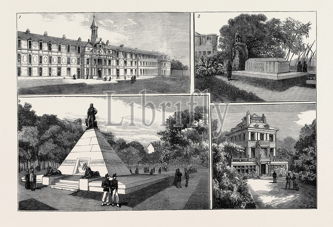 The Mariette Fête at Boulogne: 1. The New Hospital, 2. Mariette's Grave at Boulac, Cairo, 3. Statue of Auguste Mariette at Boulogne, Unveiled July 16, 1882, 4. The Villa Des Moulineaux, Mariette's House at Boulogne