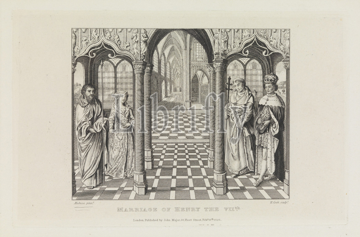 Marriage, Henry, VIIth, Elizabeth, York, February 15, 1826, Etching, engraving, chine collé, sheet, 7 1/2 x 11, 19 28 cm, Prints, After Jan Gossart, called Mabuse, Netherlandish, Maubeuge ca., 1478–1532, Antwerp, H. Cook, British, active, interior, church, King Henry VII, England stands, cleric, right, opposite, bride, stands, male attendant, left, print, created, illustration, Walpole, Anecdotes, Painting, England, additions, Rev James, Dallaway, London, Vol 1