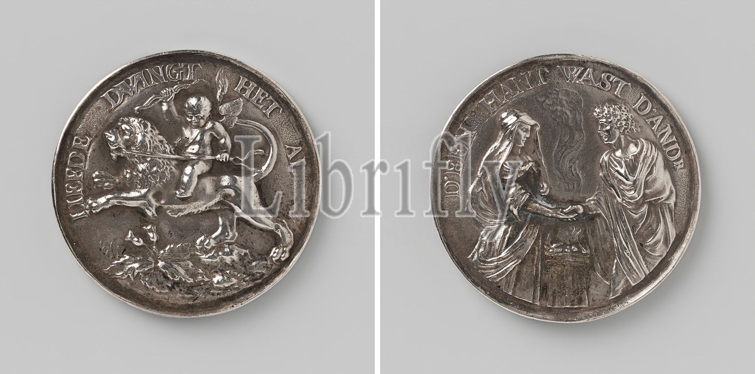 Marriage, Silver Medal. Obverse: Amor with a bow in hand, riding on a lion, in the foreground a thistle plant within an inscription. Reverse: man and woman in Roman clothing give each other a hand over burning altar within a circle, Pieter van Abeele, Amsterdam, 1658 - 1659, silver (metal), engraving, d 4.5 cm × w 24.20 gr