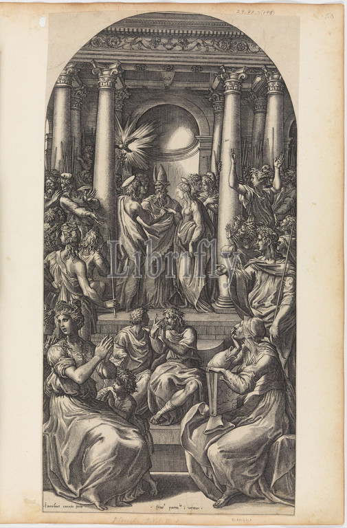 Marriage of the Virgin, ca. 1525–26, Engraving, sheet: 17 15/16 x 9 1/8 in. (45.6 x 23.2 cm), Prints, Engraved by Giovanni Jacopo Caraglio (Italian, Parma or Verona ca. 1500/1505–1565 Krakow (?)), Designed by Parmigianino (Girolamo Francesco Maria Mazzola) (Italian, Parma 1503–1540 Casalmaggiore), In Mariette Album, leaf 50