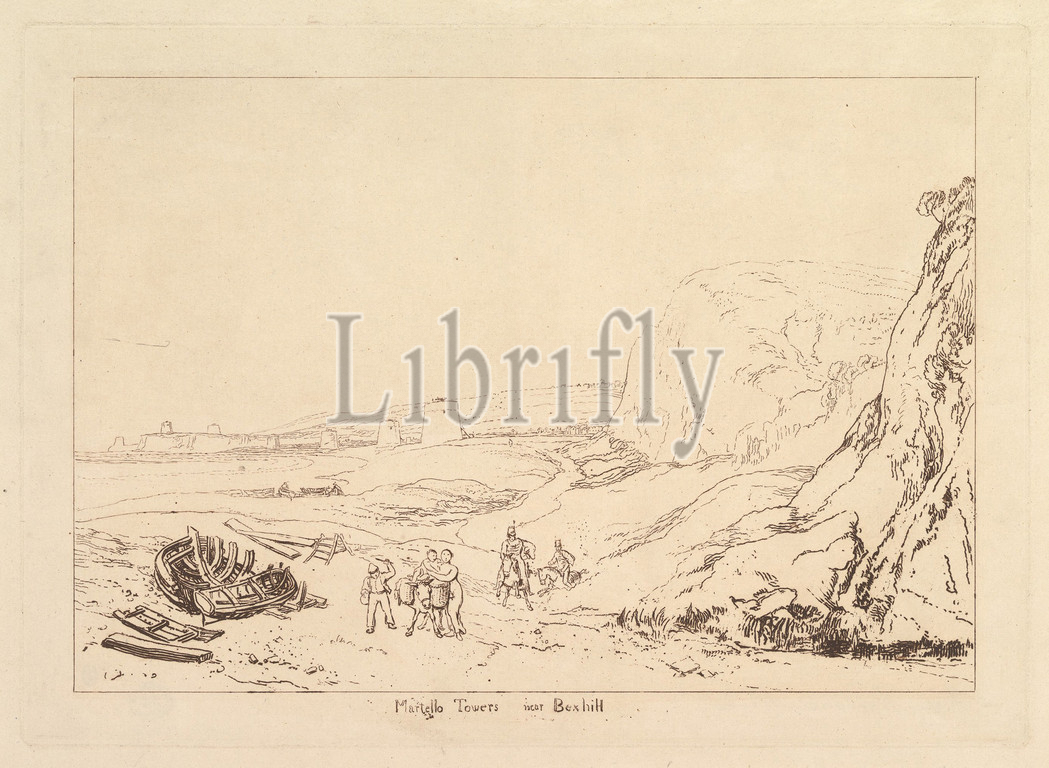 Martello Towers near Bexhill, Sussex (Liber Studiorum, part VII, plate 34), 1811, Etching; before first state of four (Finberg), plate: 7 x 10 9/16 in. (17.8 x 26.8 cm), Prints, Designed and etched by Joseph Mallord William Turner (British, London 1775–1851 London), Turner distilled his ideas about landscape In 'Liber Studiorum' (Latin for Book of Studies), a series of seventy prints plus a frontispiece published between 1807 and 1819. To establish the compositions, he made brown watercolor drawings, etched outlines onto copper plates, then usually employed professional engravers to develop tone