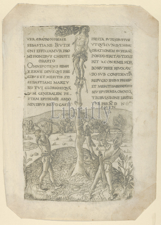 The martyrdom of Saint Sebastian, three archers below, an angel arrives bearing the crown of martyrdom, ca. 1480–90, Engraving, Sheet: 11 7/16 × 8 3/16 in. (29 × 20.8 cm), Prints, Anonymous, Italian, Florentine, 15th century, This intriguing engraving, known only through this impression, has been associated with the Florentine school, in part due to its technique, midway between the fine and broad manners, and in part because its treatment of the subject recalls a painting by the Florentine artist Antonio Pollaiuolo