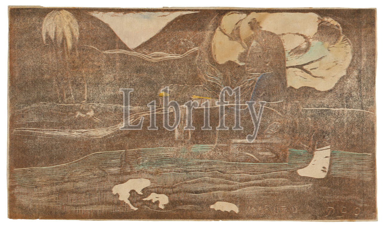 Maruru, Offerings, Gratitude, Noa Noa Suite, 1893/94, Paul Gauguin, French, 1848-1903, France, Wood-block print, printed twice, brown, black inks, selective wiping, hand-applied green, blue, two yellows, pink watercolor, ivory wove Japanese paper laid down, cream laid Japanese paper, laminate, artist, 204