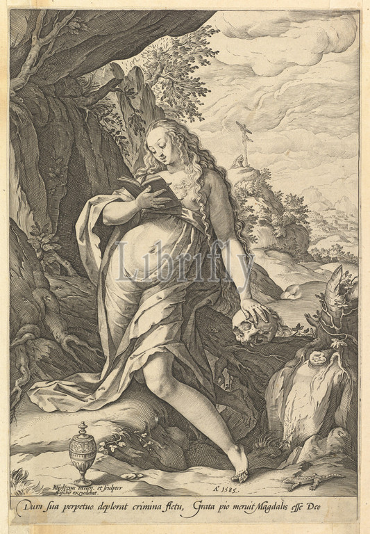 St, Mary Magdalene Penitent, 1585, Engraving, second state, two, sheet, 11 5/8 x 7 15/16, 29.6 20.2 cm, Prints, Hendrick Goltzius, Netherlandish, Mühlbracht, 1558–1617, Haarlem