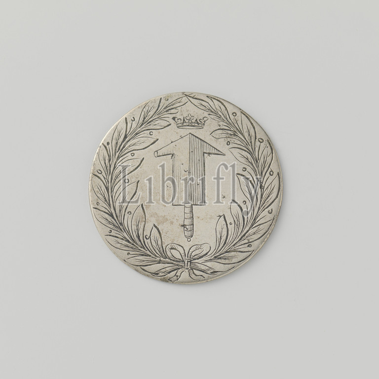 Masonry, stonemasonry, plumbing, plumbing and pumpmakers' guild of Amsterdam, guild token by Lucas Pals-Graaf, master plumber and plumbing plug, Silver Medal. Front: crowned plumber's hammer inside laurel wreath. Reverse side: crowned pump tray with two faucets within circumference, Amsterdam, Lucas Pals-Graaf, anonymous, 1687, silver (metal), engraving, d 3.7 cm × w 11.70 gr