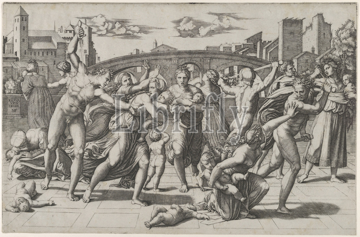 The Massacre of the Innocents, ca. 1512–13, Engraving, 11 1/16 x 16 15/16 in. (28.1 x 43.0 cm), Prints, Marcantonio Raimondi (Italian, Argini (?) ca. 1480–before 1534 Bologna (?)), After Raphael (Raffaello Sanzio or Santi) (Italian, Urbino 1483–1520 Rome)
