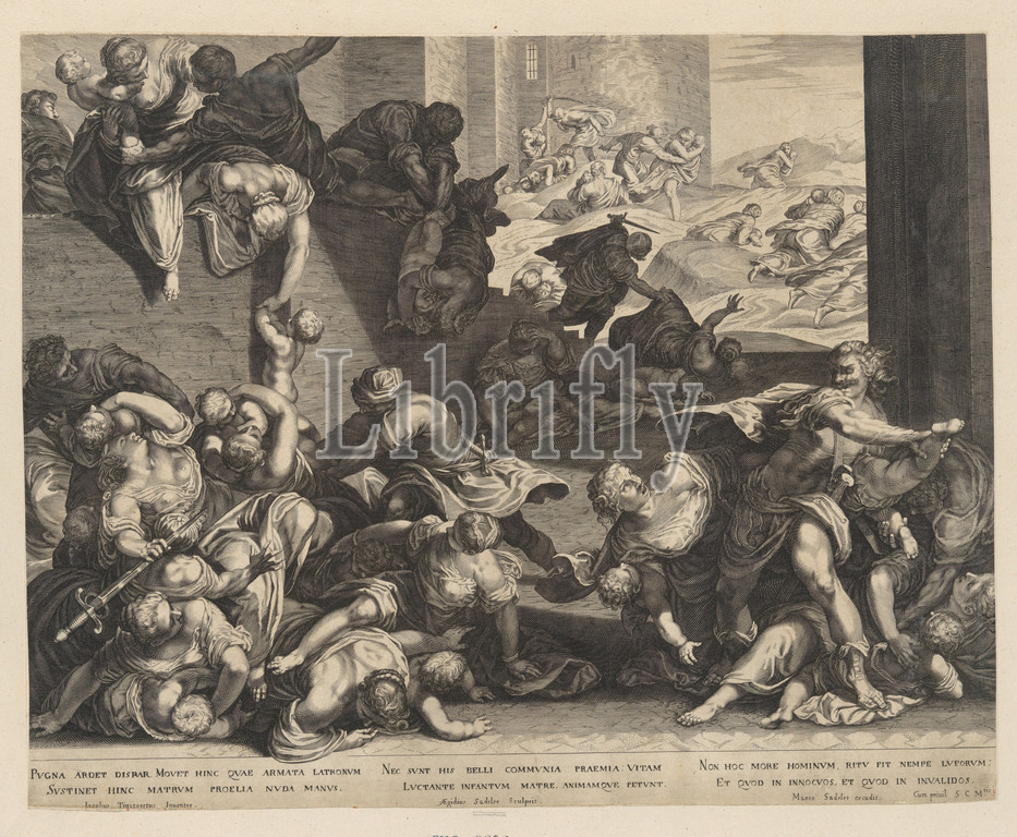 Massacre, Innocents, ca, 1600, Engraving, Sheet, 15 7/16 x 19 7/16, 39.2 49.3 cm, Prints, Aegidius Sadeler II, Netherlandish, Antwerp, 1568–1629, Prague, After Jacopo Tintoretto, Jacopo Robusti, Italian, Venice, 1519–1594