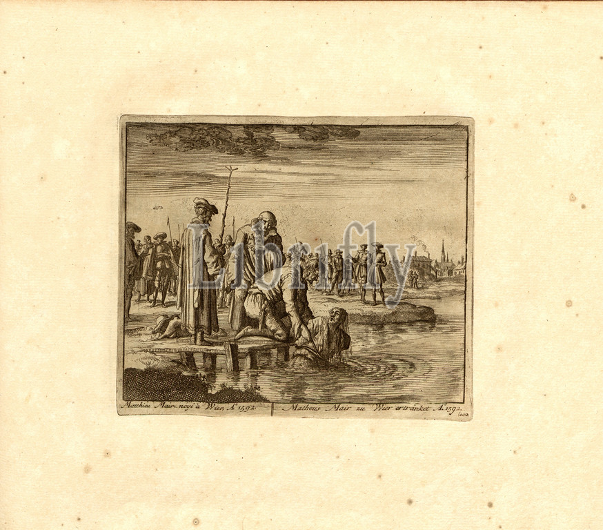Matthew Mair drowned in Wier, Anno 1592, Parallel title: Matheus Mair to Wier drowned A nn o 1592, copperplate engraving, 102.), p. 213, Luyken, Jan (inv. et fec.), Jan Luyken: Théâtre des martyrs: depuis la mort de J.Christ jusqu'à present: représenté en très belles tailles-douces = Schau-Bühne der Martyrer; gezeichnet und in Kuppfer gestochen. Leyde: chez Pierre Van der Aa, [1711]