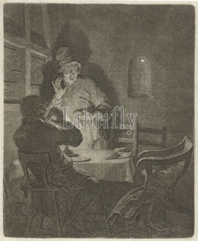 Meal in Emmaus, The two disciples from the story of the people of Emmaus in an interior, lit by candlelight, at a table on which a piece of bread. They look frightened at a third empty chair, from which Christ suddenly just disappeared after he had broken the bread for them. After this act the disciples had recognized the traveling companion they had not yet known as Christ, and He suddenly disappeared before their eyes. Above right: P. 238, Christ vanishes, supper at Emmaus, Arnold Houbraken, Northern Netherlands, 1718, paper, engraving, h 161 mm × w 133 mm