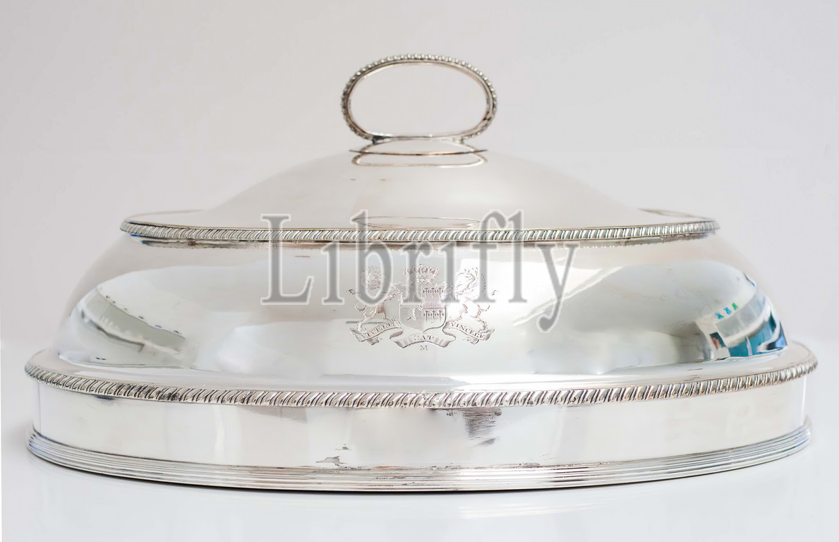 meat dish cover, about 1800, silver plated base metal, 8 x 16-1/2 x 11-1/2 in., Inscribed, by engraving, on front with armorial bearing: Vivere Sat Vincere, M, Miller House