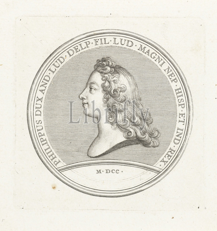 Medal, bust, Philip V, Spain, Back, medal, profile, duke, Anjou, dated 1700, year, king, Gerard Edelinck, Paris, 1702, paper, engraving
