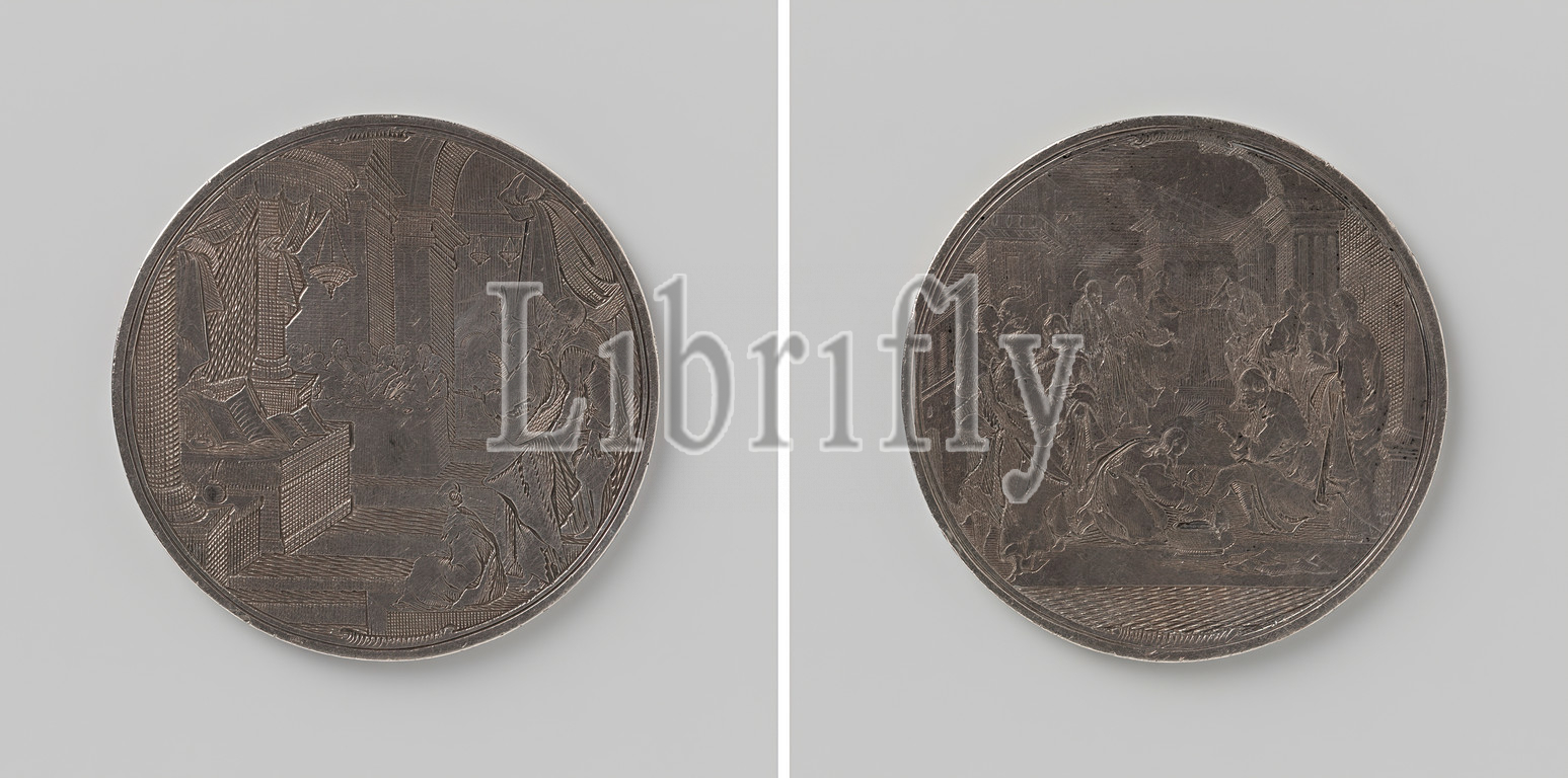 Medal with The Last Supper and the washing of the feet by Christ, Medal of silver. Front: central: group of people sitting under a gallery at the table, in the foreground on the right: three people: waving man, applauding man and sitting woman. Reverse: Christ with a crown of rays sits on knees to wash the feet of a man sitting before him, talking around, Last Supper (in general) (Matthew 26: 21-35, Mark 14: 18-31, Luke 22: 3, 22: 15-23, John 13: 21-38), anonymous, c. 1600 - c. 1650, silver (metal), engraving, d 5.7 cm × w 67.90 gr