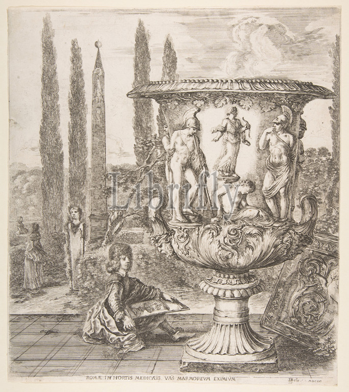 Medici vase, large, right decorated, representation, sacrifice, Iphigenia, garden terrace, teenage boy seated, left, pen, paper, drawing, vase, cyprus trees, obelisk, background, Six large views, four, Rome, two, Roman countryside, grandes vues, dont quatre de Rome et deux la Campagne romaine, 1656, Etching, second state, Sheet, trimmed, 11 1/4, 10 5/8, 28.6, 27 cm, Prints, Stefano della Bella, Italian, Florence, 1610–1664