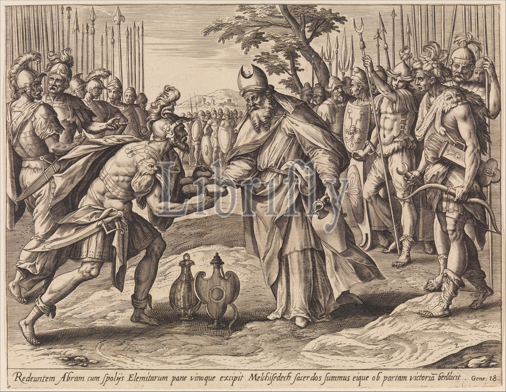 Meeting, Abraham, Melchizedek, Story, 1584–85, Engraving, first state, two, Sheet, 7 7/8 x 10 3/16, 20 25.9 cm, Prints, Adriaen Collaert, Netherlandish, Antwerp ca., 1560–1618, Antwerp, After Maerten de Vos, 1532–1603