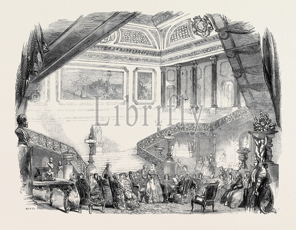 meeting, ladies' committee, stafford, home, architecture, residential, building, property, house, aid, great, display of works of art, exhibition of industry of 1851, 1851, 1850 engraving, engraved image, history, illustrative technique, engravement, victorian, arts, culture, retro styled, vintage, retro, arkheia