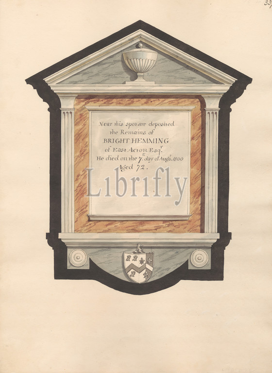 Memorial, Bright Hemming, Acton Church, Daniel Lysons, 1762–1834, British, 1796, 1811, Pen, black ink, watercolor, gouache, graphite, medium, slightly textured, cream wove paper, Sheet, architectural subject, church, memorial, Acton, England, Greater London, London, St Mary's Church, United Kingdom
